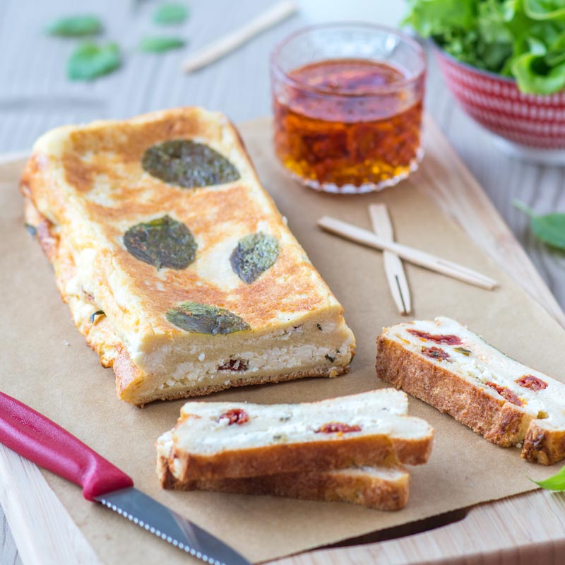 - Dispor 5 ou 6 folhas de manjericão no fundo. Colocar 3 fatias de pão por cima. Esmigalhar metade do queijo Feta e dispôr-o sobre o pão. Juntar metade do tomates secos e 6 folhas de manjericão finamente picadas. Polvilhar com 2 colheres de sopa de leite em pó. Deitar 1/3 da mistura ovo/leite.