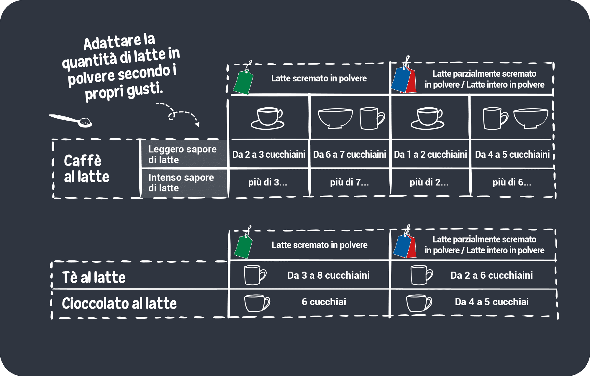 Tabella di conversione del latte per caffè, tè, cioccolata